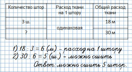 На 3 одинаковые шторы израсходовали 18 м ткани. Сколько таких штор можно сшить из 30 м такой же ткани?